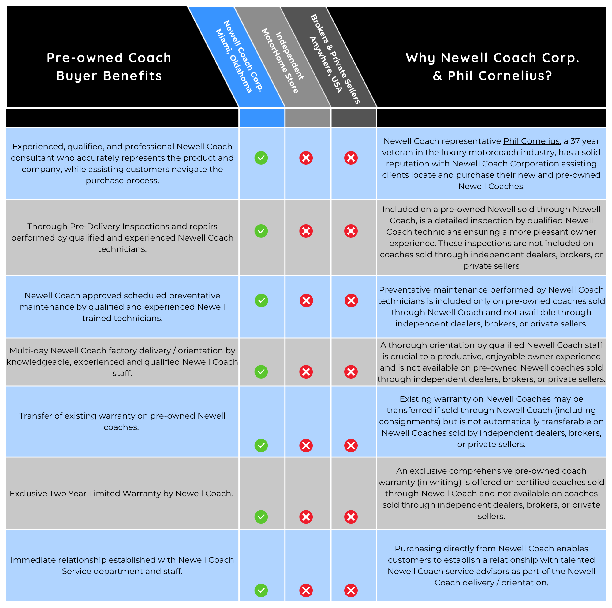 Investing in a luxury motorcoach is exciting! However, the decision of where to purchase can be daunting, especially with pre-owned motorcoaches. Newell Coach Corporation addresses and alleviates apprehensions of the unknown when purchasing a pre-owned Newell. Those who purchase factory direct from Newell Coach, receive numerous benefits not available from independent dealers, brokers, or private sellers. Learn more about purchasing factory direct. Contact Phil Cornelius today!