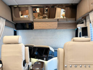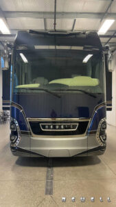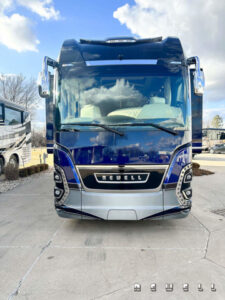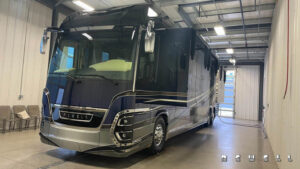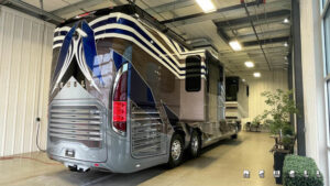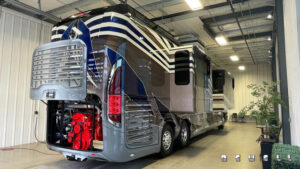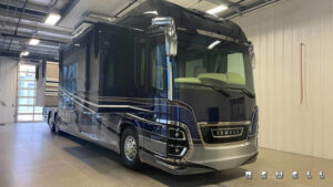 Engine Cummins X15 605-bhp 1,950-lb./ft. torqueTransmission Allison HD4000MH 6-speed automatic Axle ratio 4.18 Tires Drive axle: Michelin XZA-2 315/80R 22.5 Load Range L Front axle and tag axle: Michelin XZA-365/70R22.5 Load Range L Brakes Air disc with 6-channel ABS/ATC Suspension ZF active suspension system Steer axle: ZF independent Drive axle: ZF wide base Tag axle: ZF active steer Alternator 12-volt high amp alternator Batteries House: Six type-8D AGM sealed with PulseTech automatic equalization Chassis: Three Group 31 AGM sealed with PulseTech automatic equalizatior Steering ZF with variable ratio power steering Easi-SteerTM electronic steering assist Inverter Dual Outback 2800-watt pure sine wave Electrical service 90-amp with SurgeGuard automatic protection Generator 20 kilowatt- Tier 4 compliant Exterior width 102 inches Interior headroom 89 inches Exterior height 13 ft. 5 in. (with in-motion satellite) Gross vehicle-weight rating 63,600 lbs. Gross axle-weight rating, front 20,000 lbs. Gross axle-weight rating, drive 28,600 lbs. Gross axle-weight rating, tag 16,000 lbs. Fresh-water capacity 143 gallons Holding-tank capacity 143 gallons Fuel capacity 200 gallons DEF (Diesel Exhaust Fluid) capacity 21 gallons