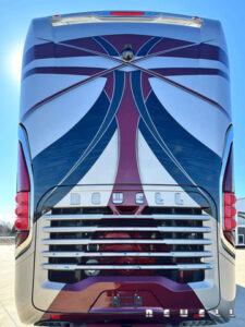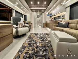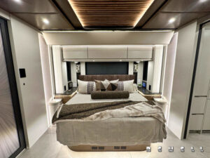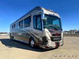 Engine Cummins X15 605-bhp 1,950-lb./ft. torqueTransmission Allison HD4000MH 6-speed automatic Axle ratio 4.18 Tires Drive axle: Michelin XZA-2 315/80R 22.5 Load Range L Front axle and tag axle: Michelin XZA-365/70R22.5 Load Range L Brakes Air disc with 6-channel ABS/ATC Suspension ZF active suspension system Steer axle: ZF independent Drive axle: ZF wide base Tag axle: ZF active steer Alternator 12-volt high amp alternator Batteries House: Six type-8D AGM sealed with PulseTech automatic equalization Chassis: Three Group 31 AGM sealed with PulseTech automatic equalizatior Steering ZF with variable ratio power steering Easi-SteerTM electronic steering assist Inverter Dual Outback 2800-watt pure sine wave Electrical service 90-amp with SurgeGuard automatic protection Generator 20 kilowatt- Tier 4 compliant Exterior width 102 inches Interior headroom 89 inches Exterior height 13 ft. 5 in. (with in-motion satellite) Gross vehicle-weight rating 63,600 lbs. Gross axle-weight rating, front 20,000 lbs. Gross axle-weight rating, drive 28,600 lbs. Gross axle-weight rating, tag 16,000 lbs. Fresh-water capacity 143 gallons Holding-tank capacity 143 gallons Fuel capacity 200 gallons DEF (Diesel Exhaust Fluid) capacity 21 gallons